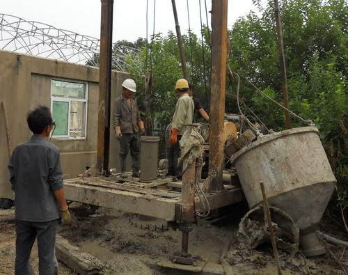 图为管港变电所增容改造工程的铁塔塔基灌砼施工现场