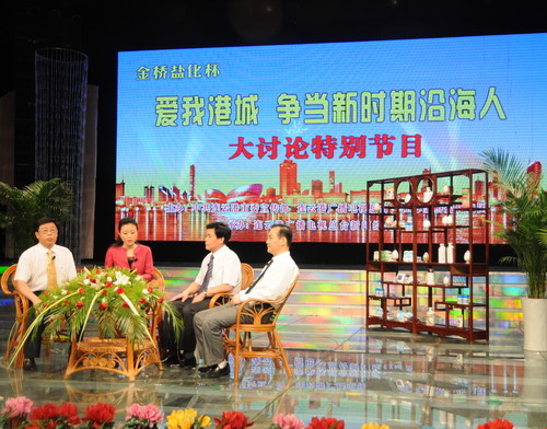 在节目现场, 顾永庚董事长首先为大家展示了集团公司化工和加工盐等各种特色产品。其后,顾永庚董事长介绍了集团公司在江苏沿海开发战略实施两年来所取得的辉煌成就,围绕沿海开发过程中金桥盐化具有的独特区域和资源优势、“十二五”发展目标定位、“创建名牌企业,共架幸福金桥”的奋斗目标等方面与嘉宾、观众进行了深入探讨。