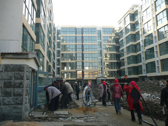 3月14日,由我公司承建的新浦兆隆小区三期配电工程正式开始兴建,图为公司工程部组织施工人员正在铺设电缆。