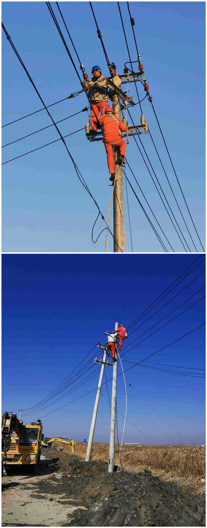2月20日下午4点48分,青口供电所接到电话通知,黄沙分场送水道挖掘机施工碰倒10千伏养殖线电杆造成整个黄下线停电,请该所尽快派人处理。该所值班领导迅速组织线路工到达现场,经勘察发现12米3向转角杆电杆碰断一根,120高压导线拉断3根.。为了不影响其他用户正常用电,果断将养殖线断路器分离,恢复黄下线其他线路正常供电。同时上报公司领导,联系机械及准备抢修所需材料。当下正值养殖池塘进水期间,为了尽快恢复养殖线供电,2月21日早上7点,抢修人员全部到位并进行安全交底及人员分工安排。7点30分所有机械到位,进行立杆、拔杆、地锚安装、更换导线等系列工作。