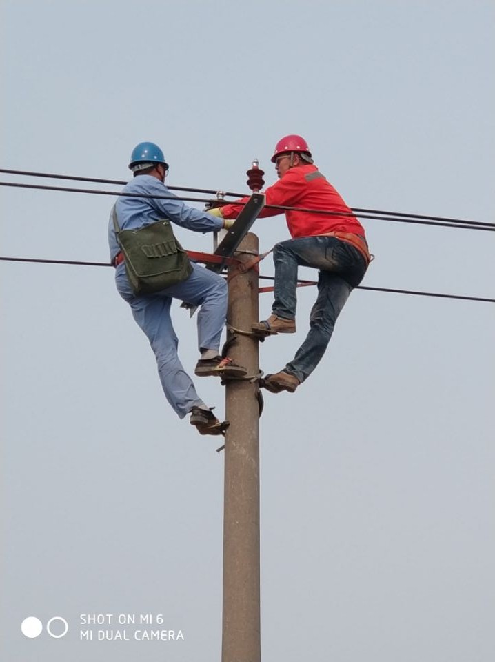 5月2日,张圩新农村小区配电安装工程施工现场,一根15米的电线杆上,荣获集团“技能大师”称号的王建采用实践教学的方法,亲自为新员工祁明智做登杆、金具安装、导线捆绑等示范操作,促其尽快掌握技术要领。