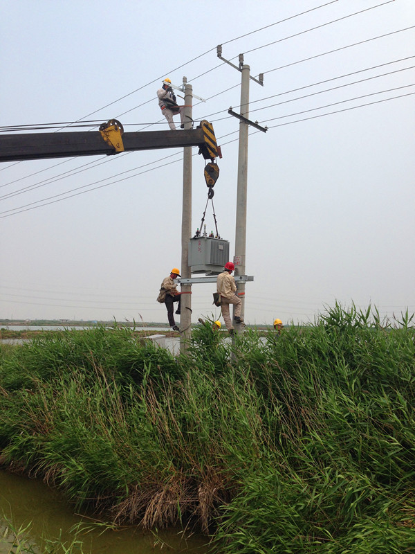 为了保证夏季高温期,大新水库2000亩淡水池塘配变尽快安装到位。6月16日,该支部组织全体党员开展了党员奉献日活动,全体党员早晨7点钟上班,工作近9小时,他们不怕天气炎热,不怕施工难度大,为职工做出了表率。图为职工在施工中(宋忠文)