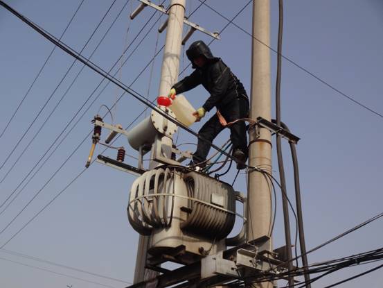 图为维护人员正在为居民生活区的变压器进行加油