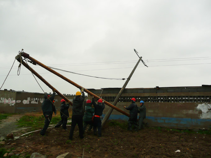 2月3日(正月初九)早上五点多,台北供电所电力抢修值班室电话急促响起,变电所操作工反映10KV太和线跳闸失电。10KV太和线是台北供电所非常重要的一条供电线路,是向顺天木业、苏交集团、市政沥青等大型企业供电的重要通道,失电意味着企业生产停工。接警后,供电所外线组组长孙忠青立刻带人沿线全面检查。经过两个小时的排查,终于发现处于线路末端的高速公路低压线路的五根电杆被施工的挖掘机 撞断拉折。获此情况,所领导立即组织人员,准备材料,协调吊车,安排运送电杆。这时天空正下着小雨,更增加了施工的难度。为了尽快抢修,恢复供电,抢险队伍加速向事发地点开进,寒风中的雨滴,打在职工的头上脸上,大家毫不在意,一心扑在抢修线路上。运送电杆的道路泥软地陷,机器吊装遇到死角,他们就肩扛手拉。为了抢时间,争速度,他们中午就在工地吃点快餐。在全体职工的共同努力下,到下午五点左右全面完成了抢险工作。