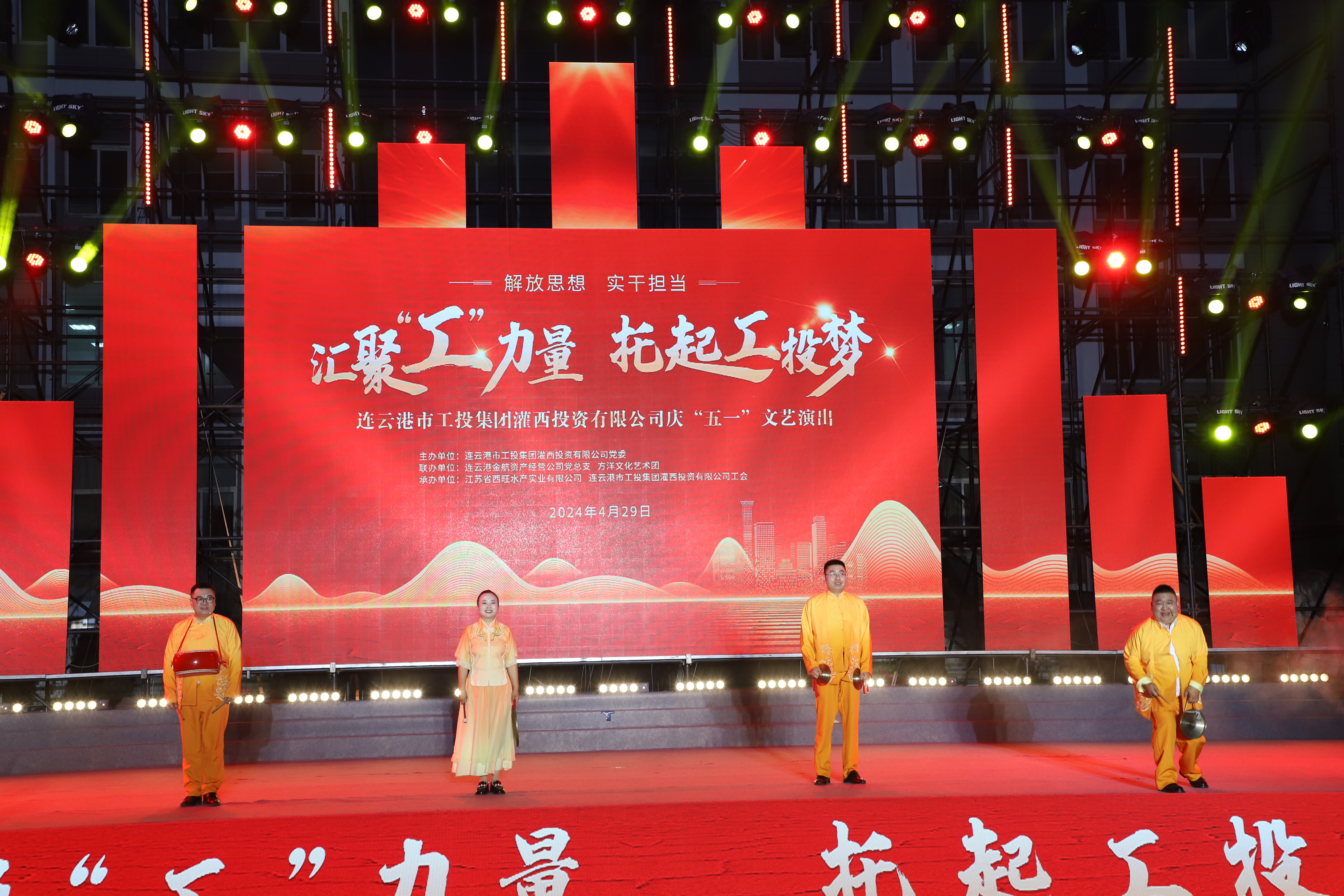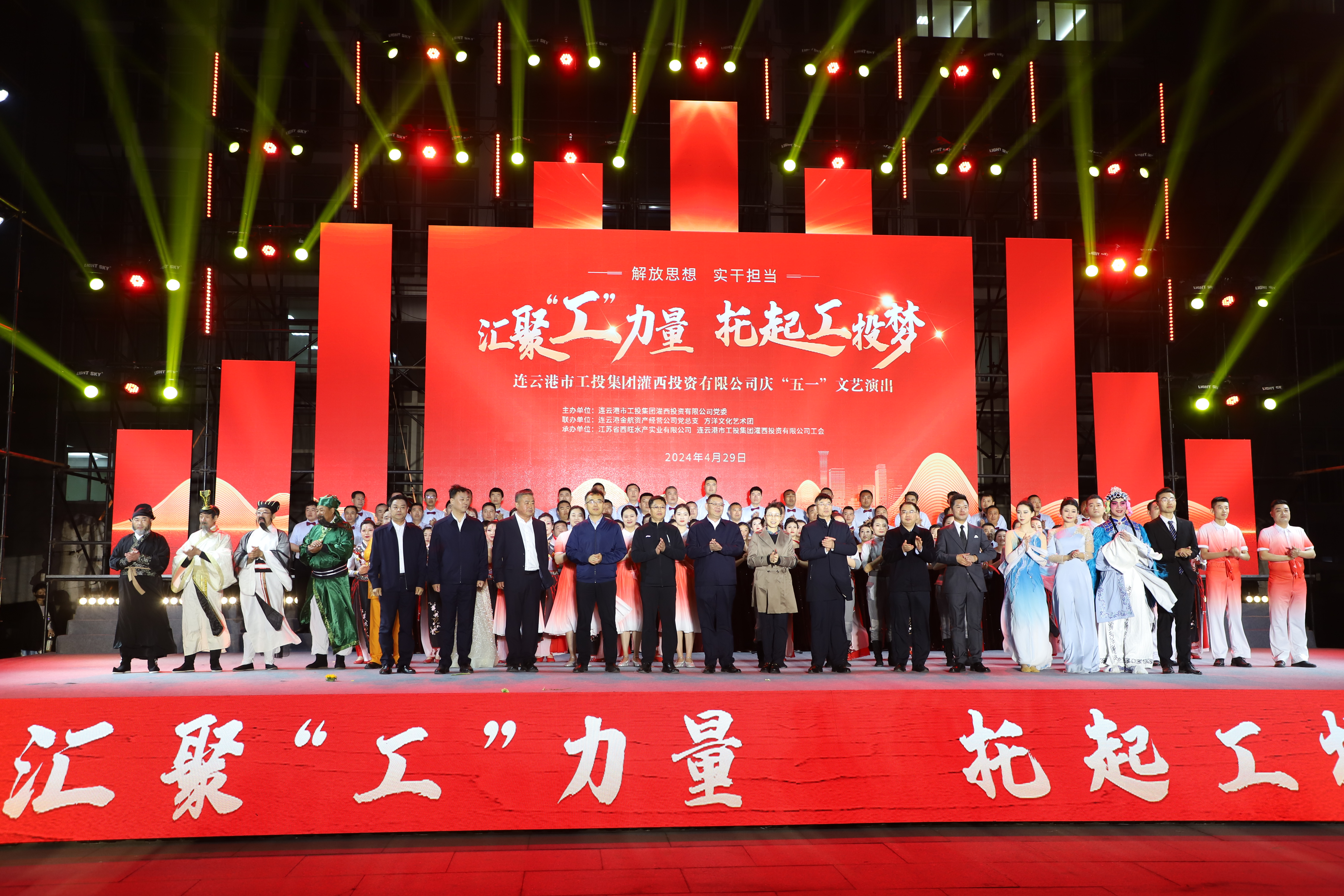 4月29日晚,灌西投资公司《汇聚“工”力量,托起工投梦》庆“五一”文艺演出在机关大楼前广场举行。本次活动由灌西投资公司党委主办,连云港金航资产经营公司党总支、方洋文化艺术团联办,旨在通过艺术的形式,营造崇尚劳模、学习先进、尊重劳动的良好氛围,丰富公司员工的文化生活,激发干事创业热情。集团公司领导张六林、戴鸿鸣、汪群及部分部门负责人,灌西、金航资产经营公司领导班子成员出席演出活动,县临港产业区管委会、华能灌云清洁能源发电责任有限公司、徐圩新区方洋集团等有关领导受邀观看演出。