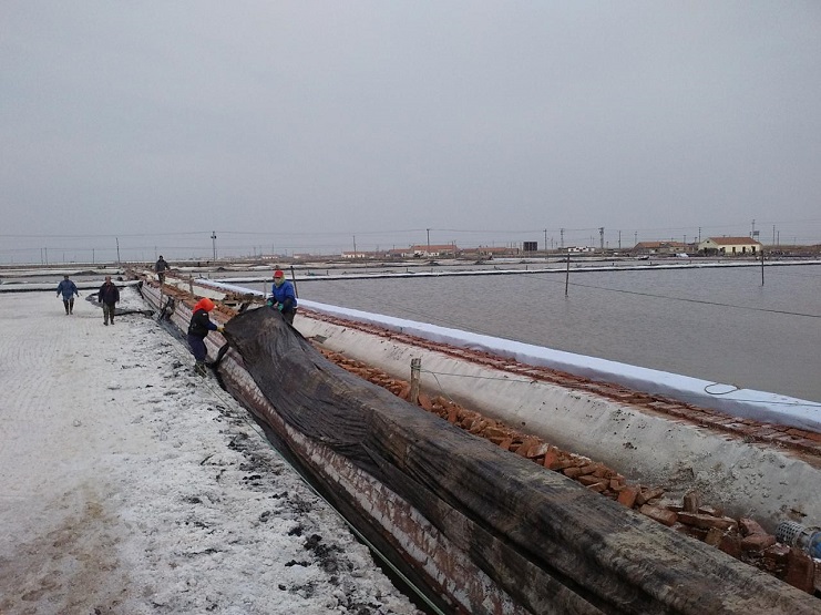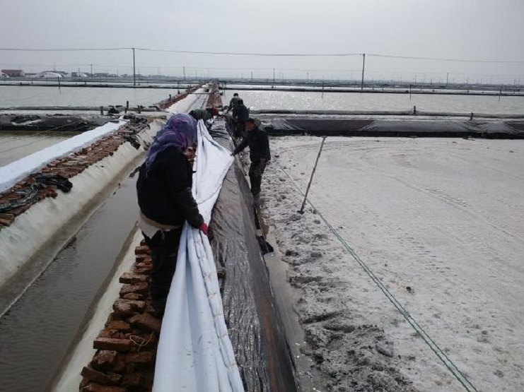 新河制盐分公司为了尽快改善食用盐基地面貌,减少池埝上固化红砖风化,沙尘落入盐池内,对池盐的污染,近期组织分公司职工,对基地塑池的红砖固化池埝进行处理,先用黑塑布把池埝重包一遍,然后再用土工布苫好。有效地减少了杂物落入池盐中,为产合格食用盐提供了良好生产环境。(图为职工们正在苫盖红砖固化池埝。)