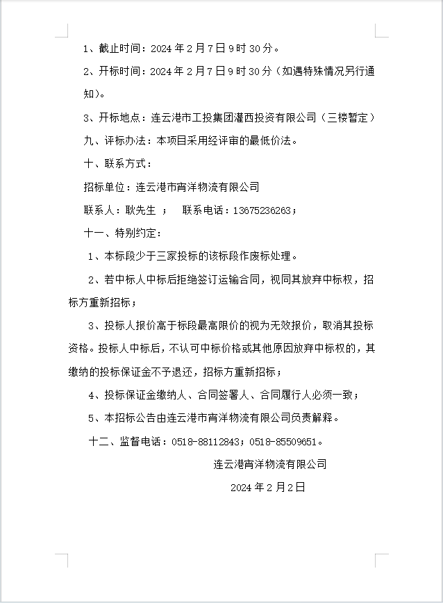 连云港宵洋物流有限公司船舶运输服务业务招标公告