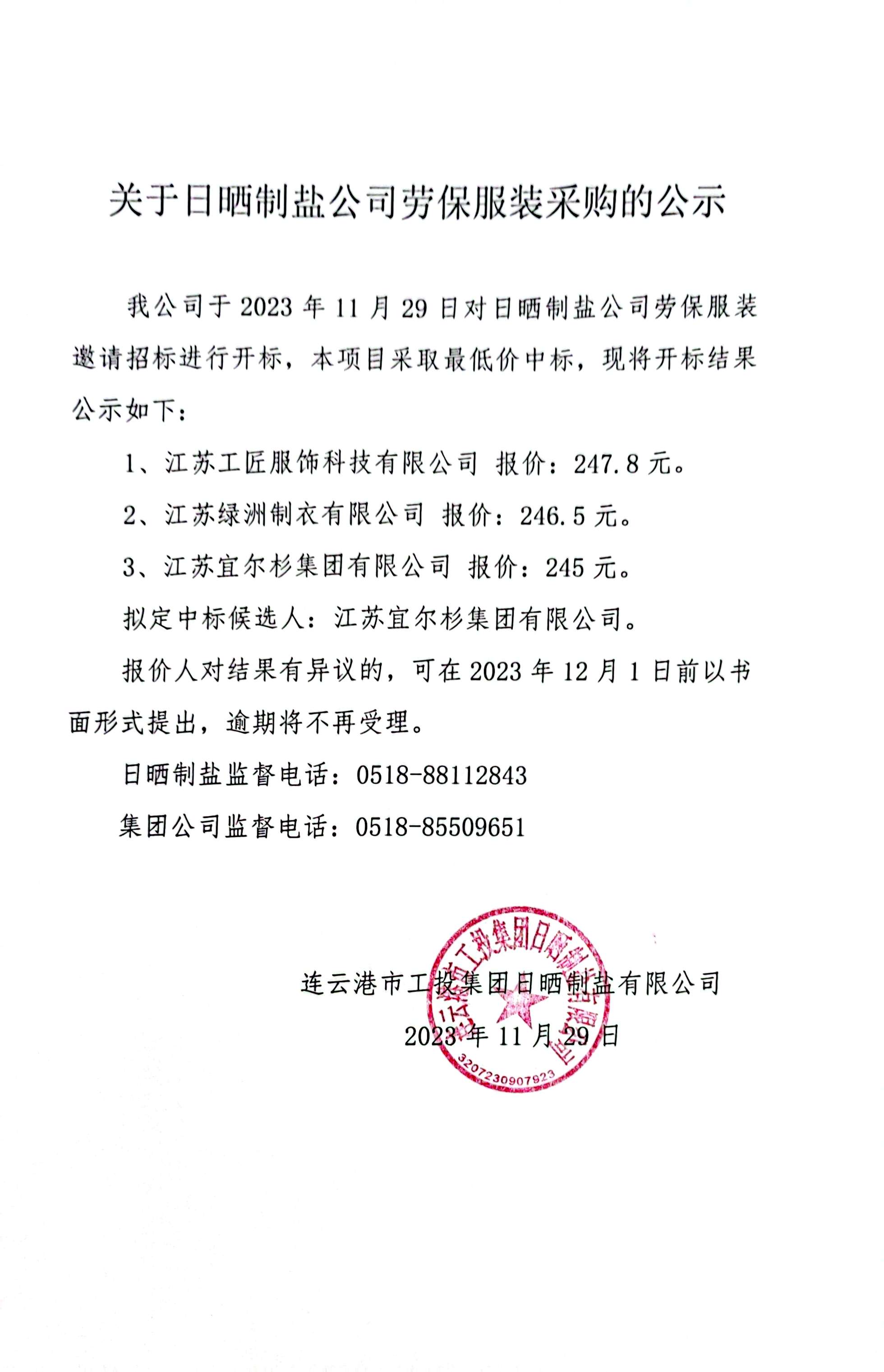 关于日晒制盐公司劳保服装采购的公示