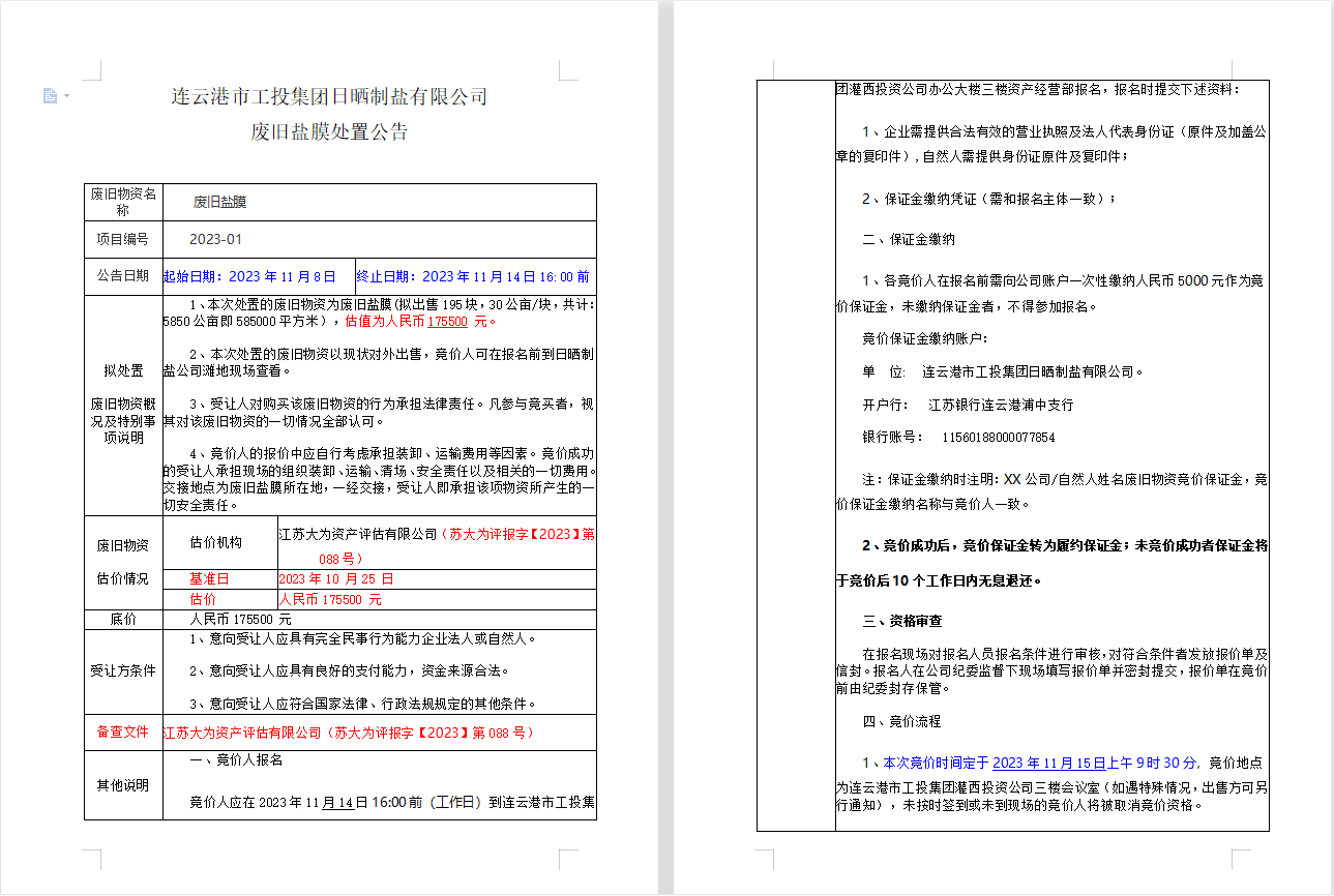 连云港市工投集团日晒制盐有限公司废旧盐膜处置公告