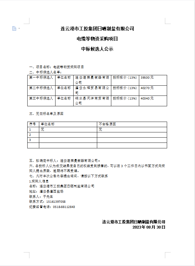连云港市工投集团日晒制盐有限公司电缆等物资采购项目中标候选人公示