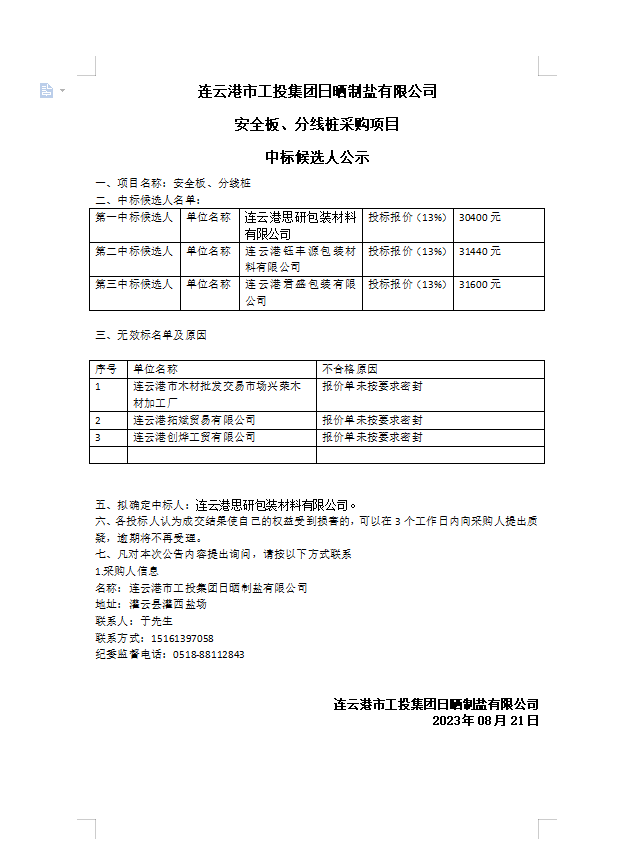 连云港市工投集团日晒制盐有限公司 安全板、分线桩采购项目 中标候选人公示