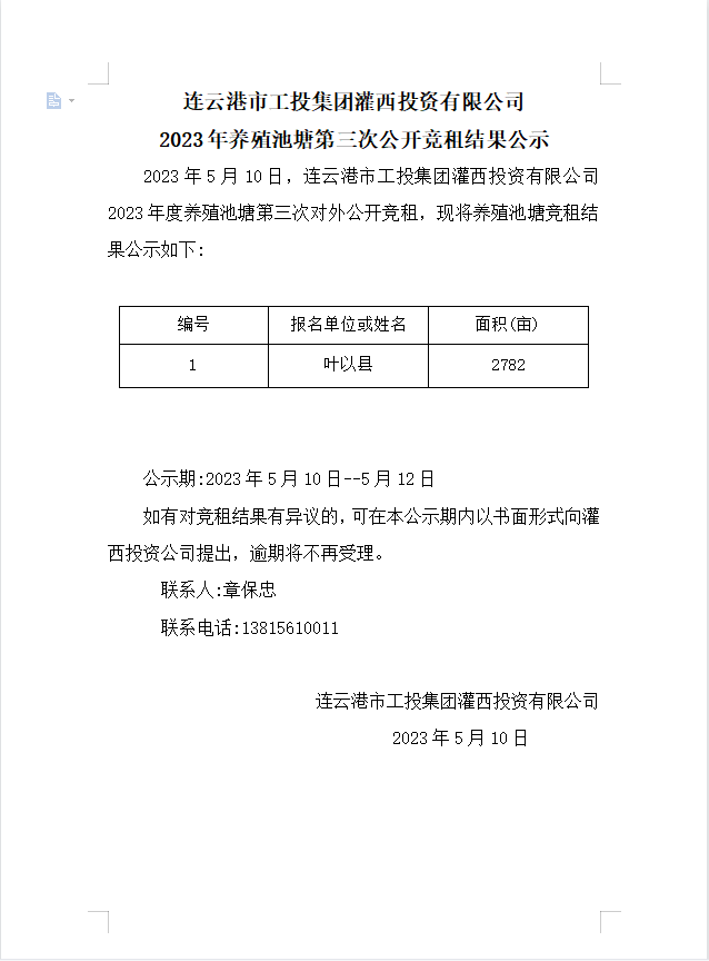 连云港市工投集团灌西投资有限公司2023年养殖池塘第三次公开竞租结果公示