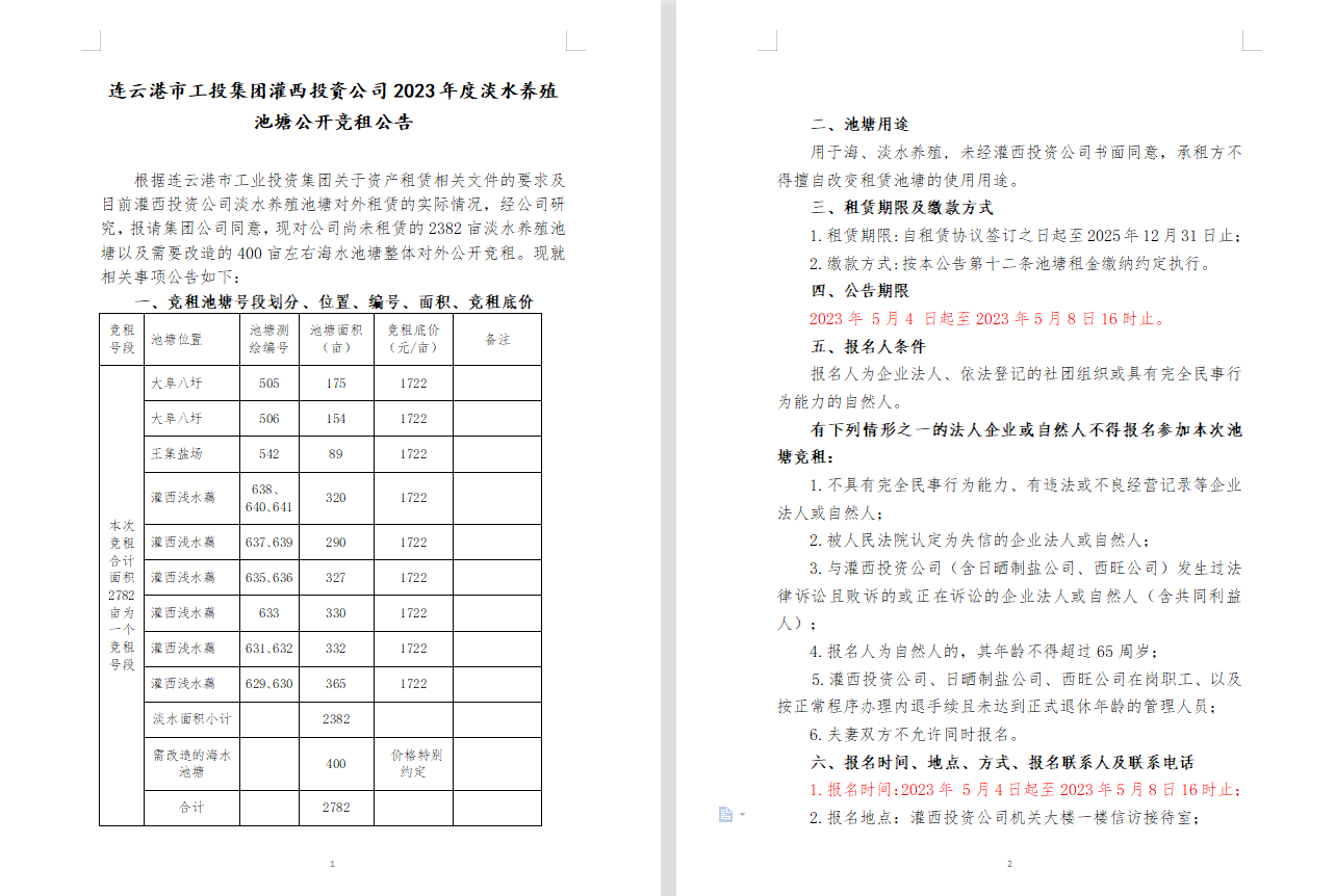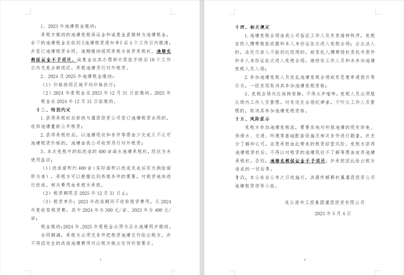 连云港市工投集团灌西投资公司2023年度淡水养殖池塘公开竞租公告