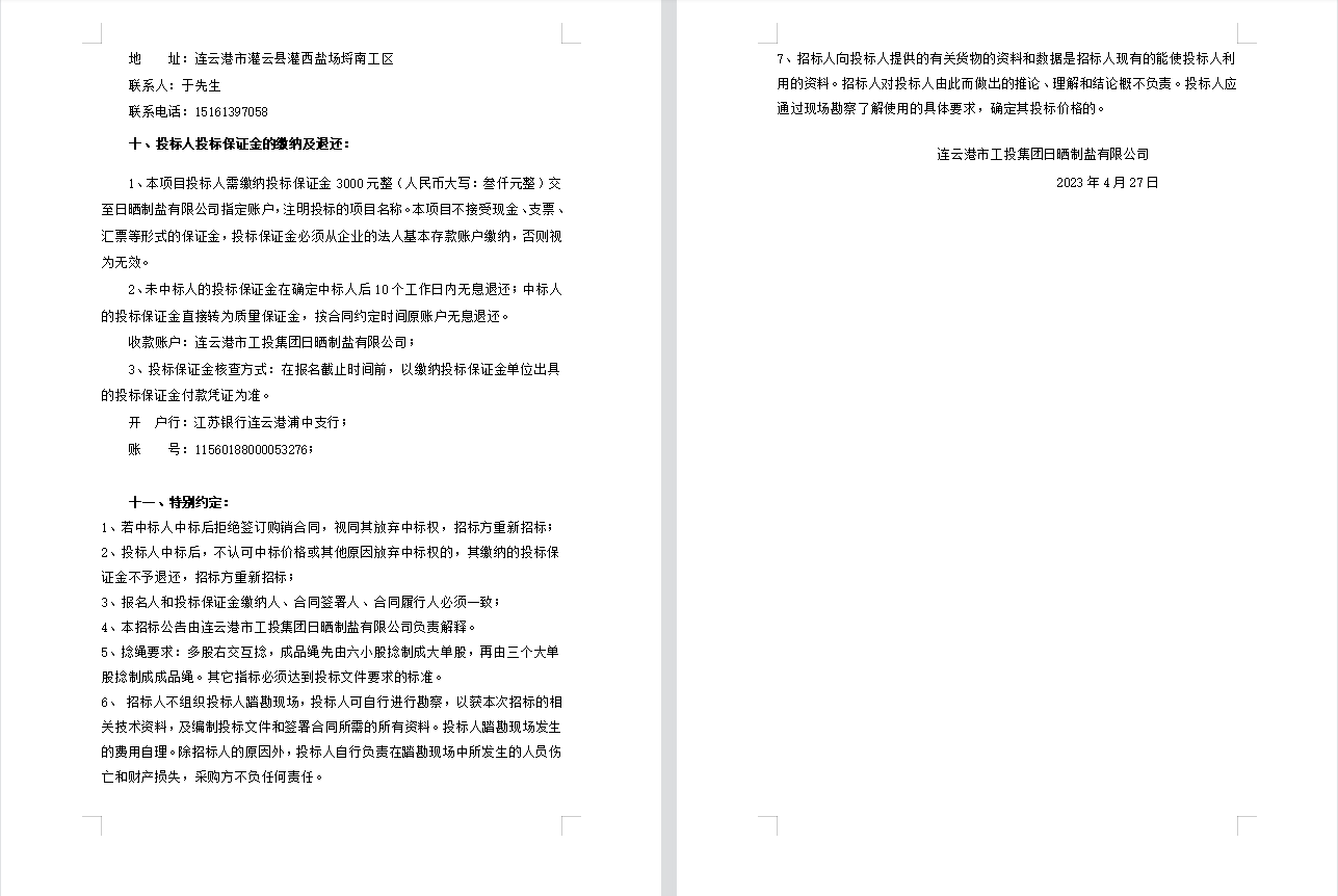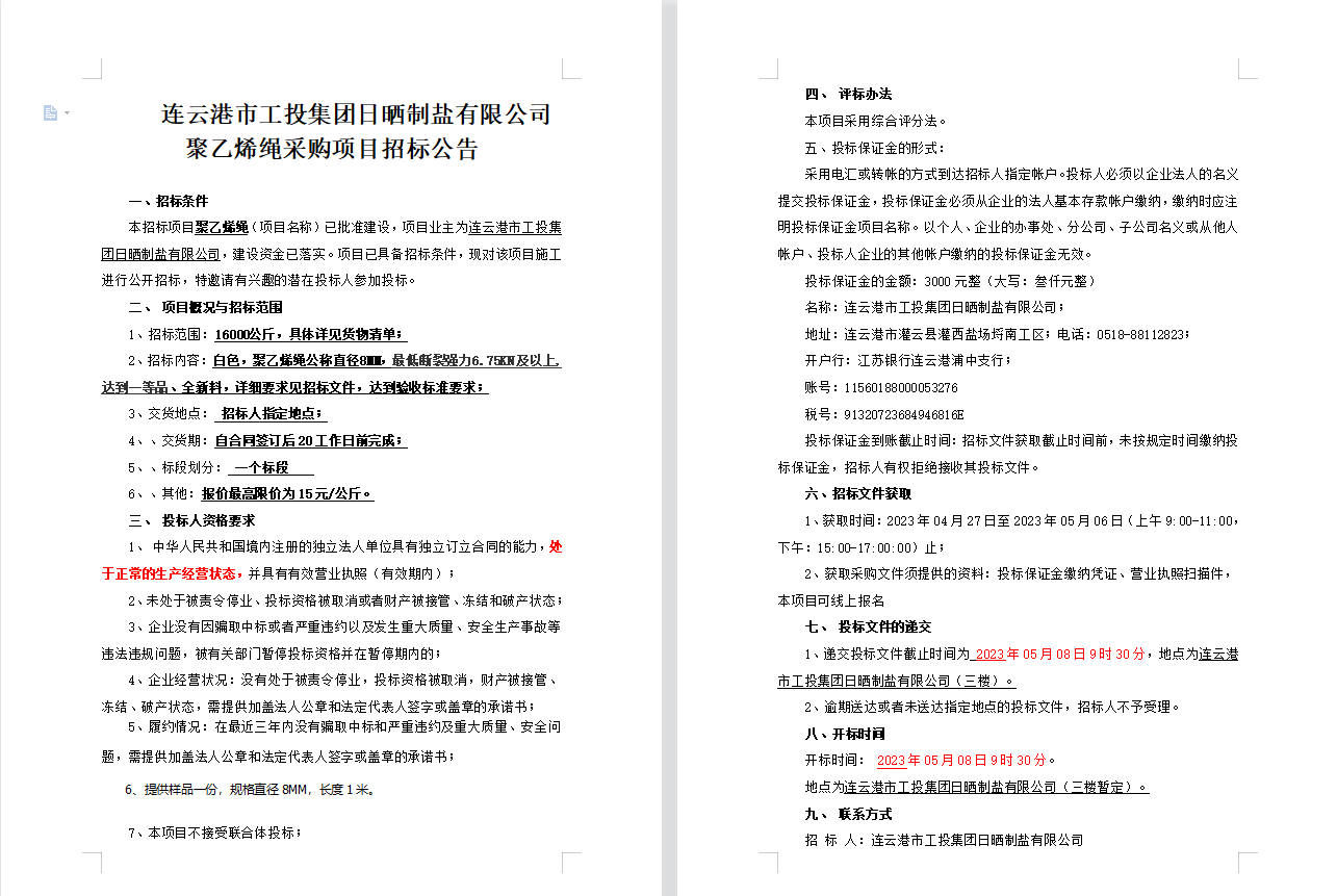 连云港市工投集团日晒制盐有限公司聚乙烯绳采购项目招标公告