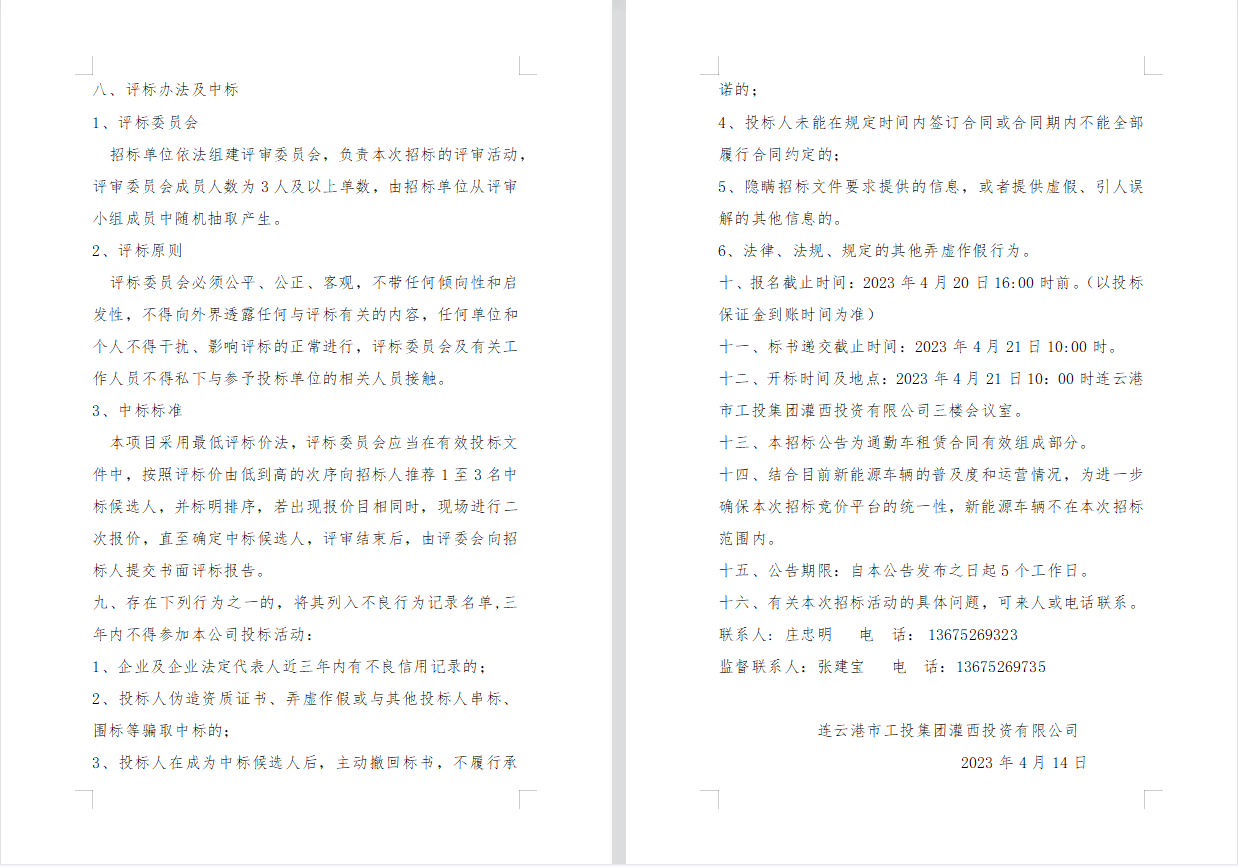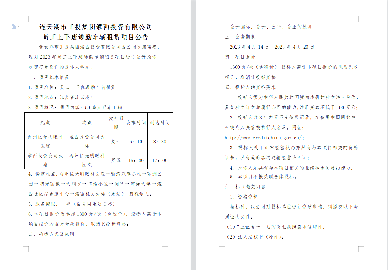 连云港市工投集团灌西投资有限公司 员工上下班通勤车辆租赁项目公告