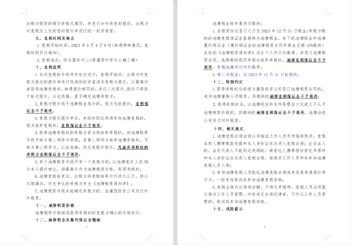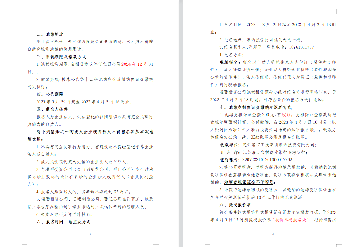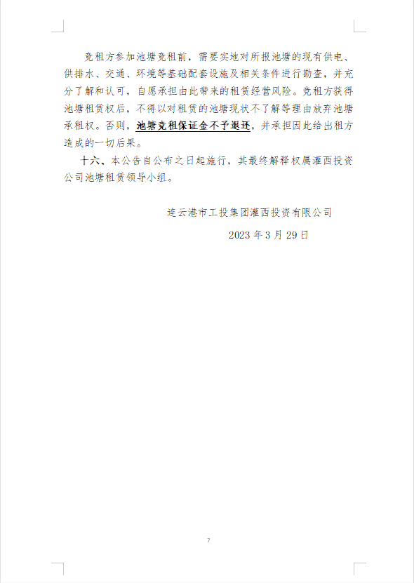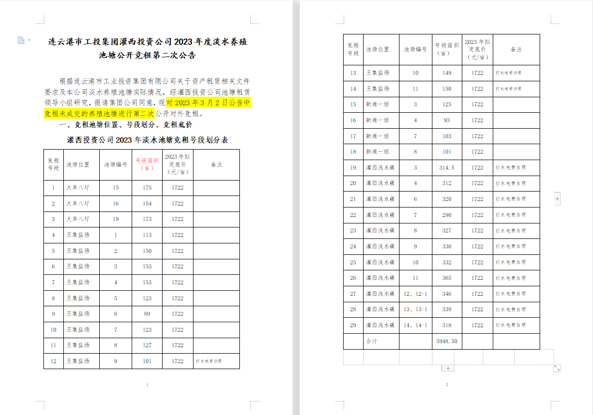 连云港市工投集团灌西投资公司2023年度淡水养殖池塘公开竞租第二次公告