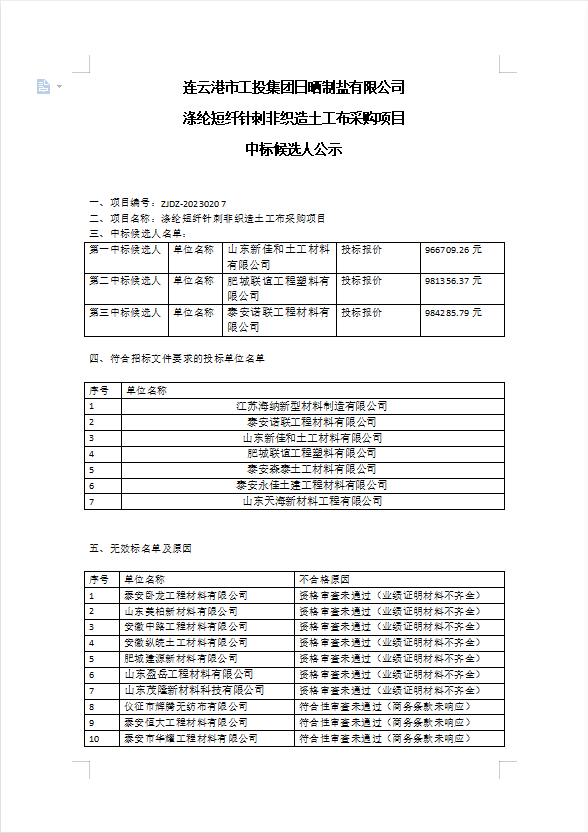 连云港市工投集团日晒制盐有限公司涤纶短纤针刺非织造土工布采购项目中标候选人公示