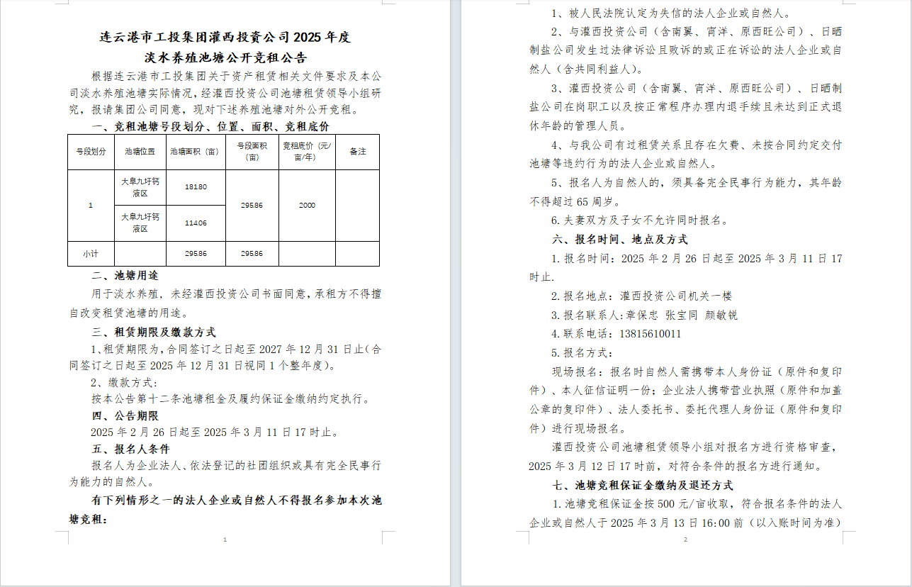连云港市工投集团灌西投资公司2025年度淡水养殖池塘公开竞租公告