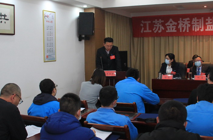 朱桂玉代表金桥制盐公司向大会作工作报告。报告首先回顾了“十三五”期间的工作:一是坚定不移地开拓销售市场,扩大了企业知名度;二是坚定不移地实施设备更新,提升了自动化程度;三是坚定不移地推动科技创新,实现了提质创效;四是坚定不移地保证质量稳定,赢得了市场认可;五是坚定不移地重视安全生产,夯实了发展基础;六是坚定不移地加强思政工作,打造了和谐企业。之后,从疫情防控、产品销售、生产组织、经营管理、和谐发展等五个方面总结了2020年取得的成绩。