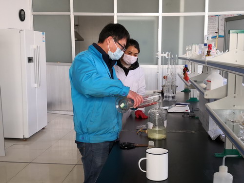 疫情防控期间,化验室认真落实公司防控工作要求,每天配制75%浓度的乙醇,每天配制84消毒液约200L,配制二氧化氯消毒液1000余升,供全公司及外来车辆消毒。车间复工复产后,全体化验员坚守岗位,做好产品检测工作。每日做好进厂原料的检验,并按频次抽检车间生产的半成品及成品,每个班次抽检样品200个左右,质管部认真做好每天出厂产品的检验。虽然工作量有所增加,但他们没有任何怨言,立足岗位、勇于担当,落实好疫情防控工作要求的同时,严把产品质量关。