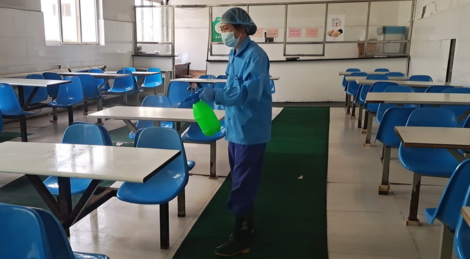 落实防疫措施图为餐厅消毒