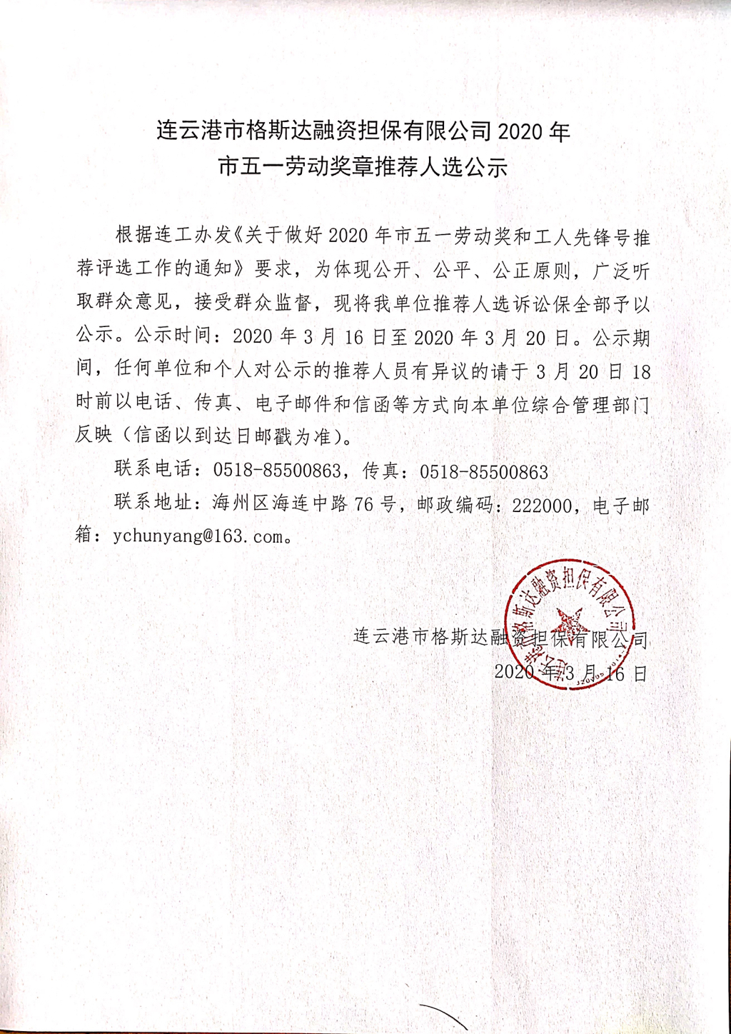 连云港市格斯达融资担保有限公司2020年市五一劳动奖章推荐人选公示