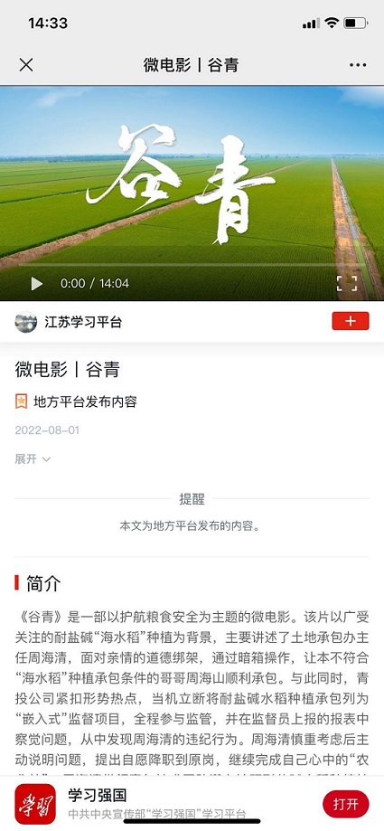 近日,由连云港市工投集团青口投资公司自编自演的微电影《谷青》入选学习强国---江苏学习平台。