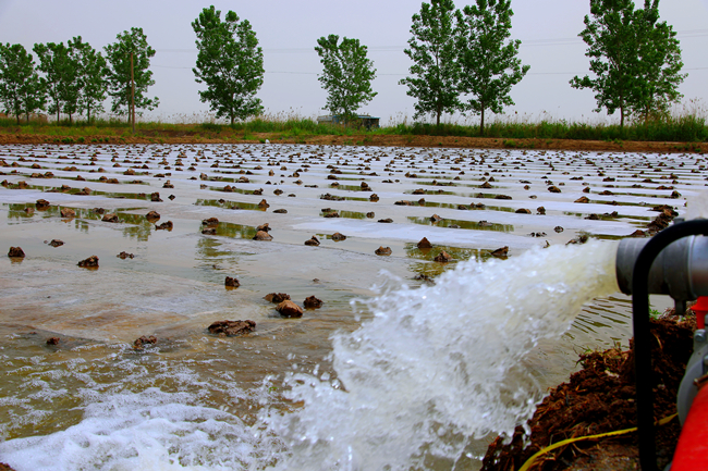 ▲塑盘育秧后进入秧苗管理期,条田管理工正引水灌溉,全力做好保苗护苗工作,为下一步序时推进插秧工作打下基础。