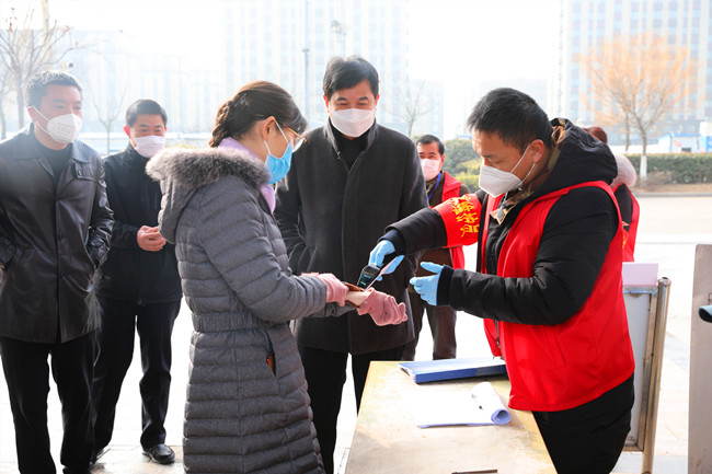 汪书记一行在公司疫情防控检查站前,详细了解了公司疫情防控情况,青农一路作为主要的进场通道,四个单位的党员干部轮流值班,并设置临时看护房,保证二十四小时值班。在盐场家园小区仅保留一个出口,外来家用轿车一律禁止入内,每户发一张通行证,严格管控人员流动。汪书记得知物业公司还没有完成,鼓励大家非常时期用非常办法,将工作做细做实,想居民所想,严格做好防控工作。进入小区前,汪书记也与居民一样配合登记和测量体温,当看物业为了保证每天定时对单元和电梯间等重要场所的消毒存有大量消毒液,强调物业公司要增强消毒物品存放安全意识,合理使用,尽最大努力保一方平安。