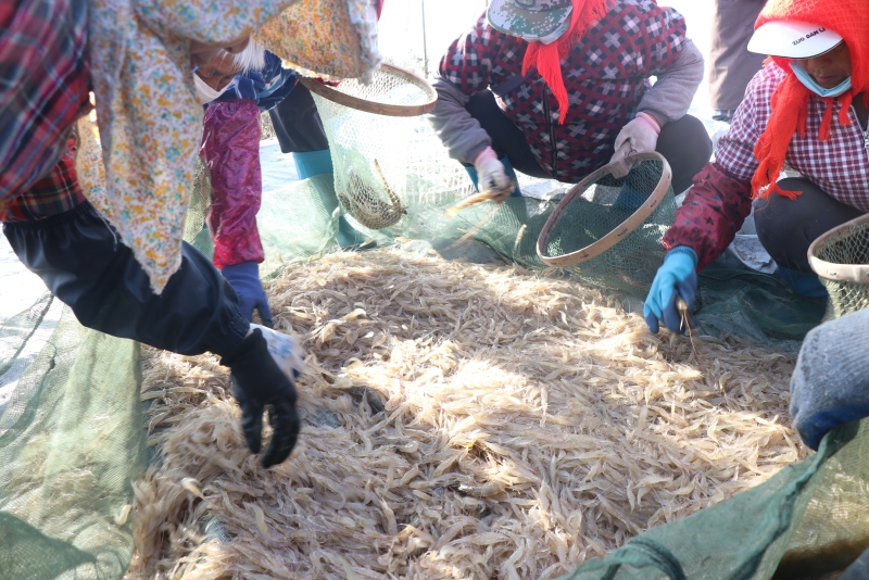近日,三洋分场养殖区脊尾白虾陆续起捕出售。据了解,脊尾白虾亩产约60-120斤,比去年同期产量略高,均价在15-26元。(三洋分场)