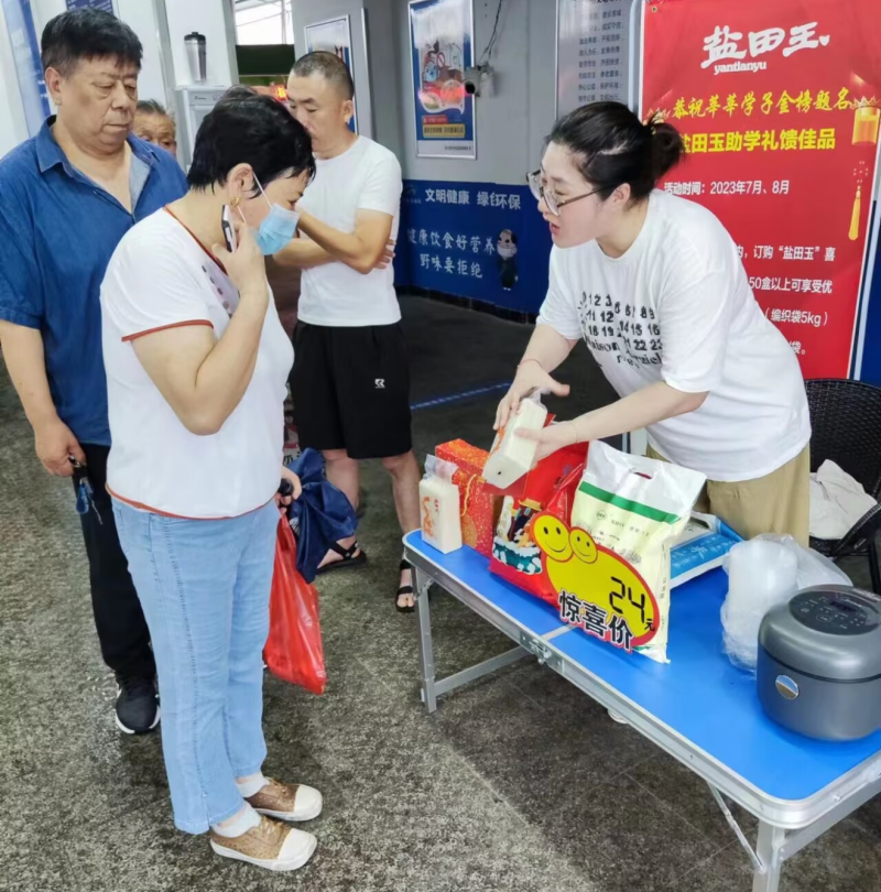 近日,米业营销中心销售团队抓住中、高考升学宴契机,在巨龙路农贸市场门口开展现场推介活动,向往来市民细心讲解盐田玉大米,进一步加大宣传盐田玉粮油直营店的力度,获得更多消费者的认可。(田钟超)