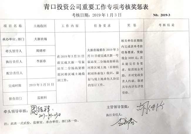 【表单考核】青口投资公司重要工作专项考核奖惩表