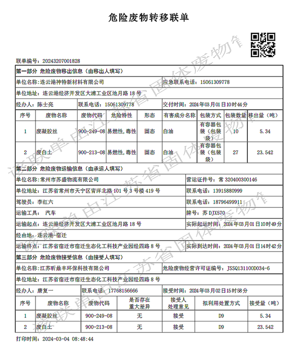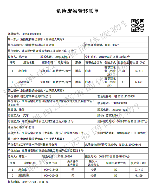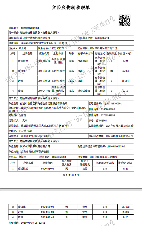 2024年第一季度危废处置情况公示
