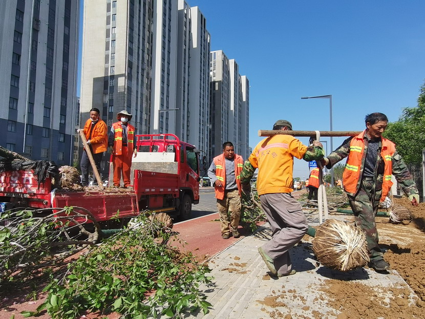 5月1日早上七点不到,在镜湖路上,四十余名绿化工人已经开始卸苗、栽苗。为确保有序施工、保质保量、按期完成,公司负责人范晓宝带领技术人员坚守在施工一线,牢固树立时间观念,强化职责使命,督促指导抢时间、赶进度、保质量,全力加快挖坑整地、苗木种植、草坪铺垫、浇水修剪等工作。同时,督促做好现场安全、后勤保障相关工作。当日下午,累计种植小叶黄杨300余平方米、日本晚樱70余棵。