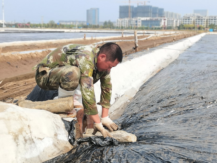 矿盐班组根据天气状况做好雨前塑布苫盖工作,确保劳动成果不受暴雨影响,最大化实现年产量,并利用扒盐停机间隙做好滩地基础工作,维护输盐管道及集盐机,以便于扒盐开机高效率运转。