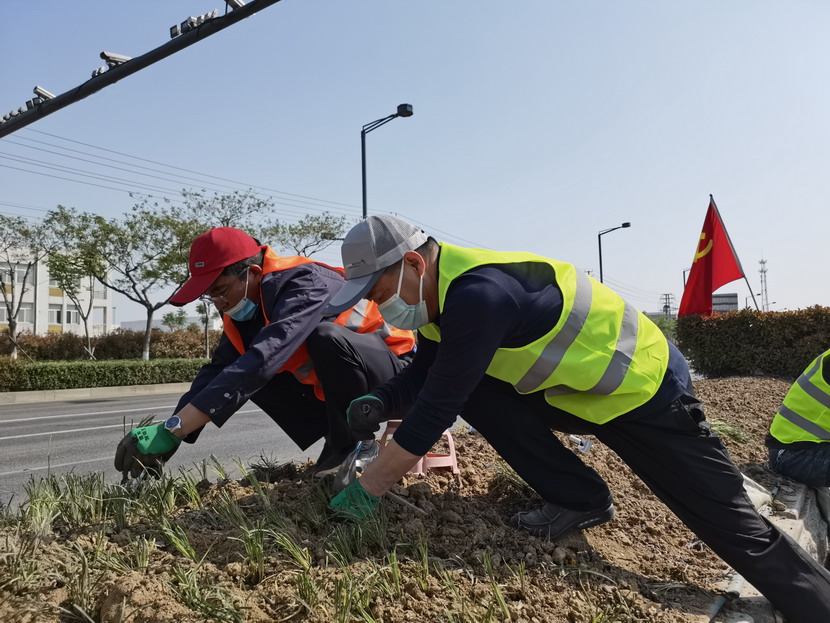 临达、美多利、资源分公司等党支部组织联合突击小队,从4月30日起主攻黄海大道绿化责任区,时至中午“不下火线”,党员职工就着矿泉水,啃着自带的煎饼,节约时间抢工期。