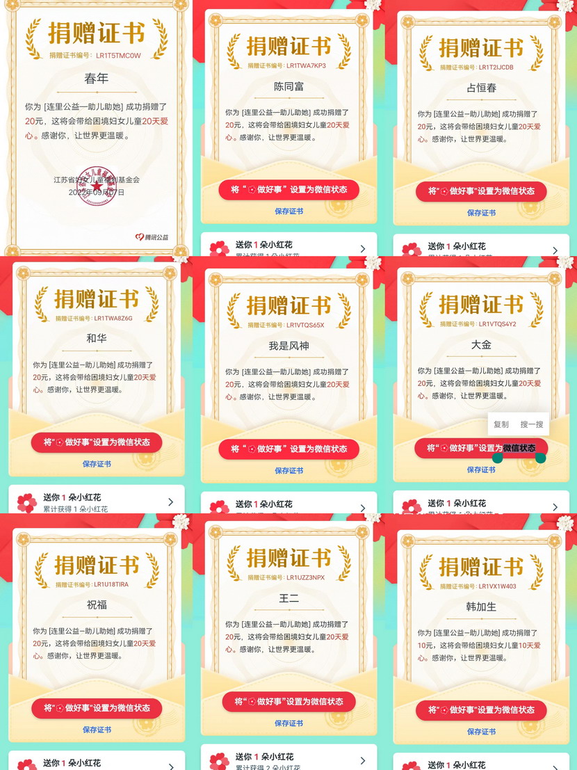 99公益日”是响应国家95日中华慈善日号召,由腾讯公司联合数百家具有公开募集资质的慈善组织共同发起的全民公益活动。近年来,在海州湾公司,传播社会正能量、弘扬社会正气的良好氛围日益浓厚,涌现出捡数千元现金归还失主的朱文健、帮扶救助中暑晕倒老人的王绪峰、免费理发多面手霍正钢等等数名爱心职工。在99公益日”募捐活动中,虽然公益平台最低募捐金额1元即可,但是广大职工尽力奉献自己的一份力量,1020元比比皆是,气氛十分热烈。大家纷纷表示,奉献爱心、扶贫济困是每个社会公民应尽的责任和义务,只要人人都献出一点“爱”,就能形成“滴水成河、汇流成海”的磅礴力量