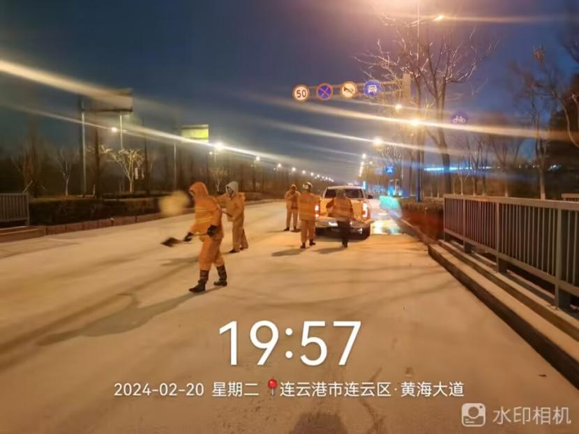 夜晚10点,在黄海大道,支部书记范晓宝亲自带队,带领张岩、盛小雷、薛加兵等6名党员,冒雪奋战、连续作业,抛撒融雪剂,进行紧急除雪除冰作业。