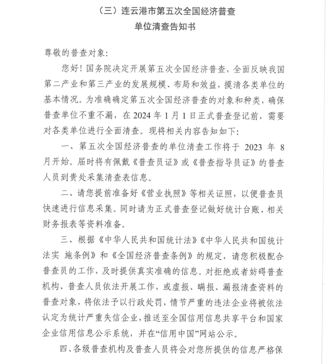 按照《全国经济普查条例》规定,国务院决定于2023年开展第五次全国经济普查,为提高经济普查质量,进一步推进普查工作顺利开展,公司按照上级第五次全国经济普查宣传动员工作要求,现将《连云港市第五次全国经济普查单位告知书》公示如下: